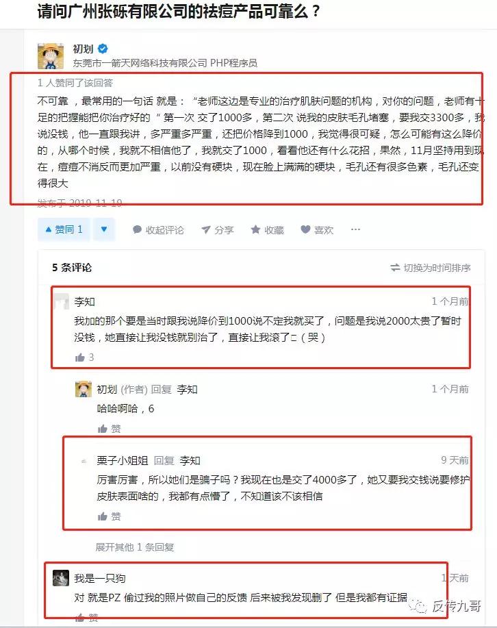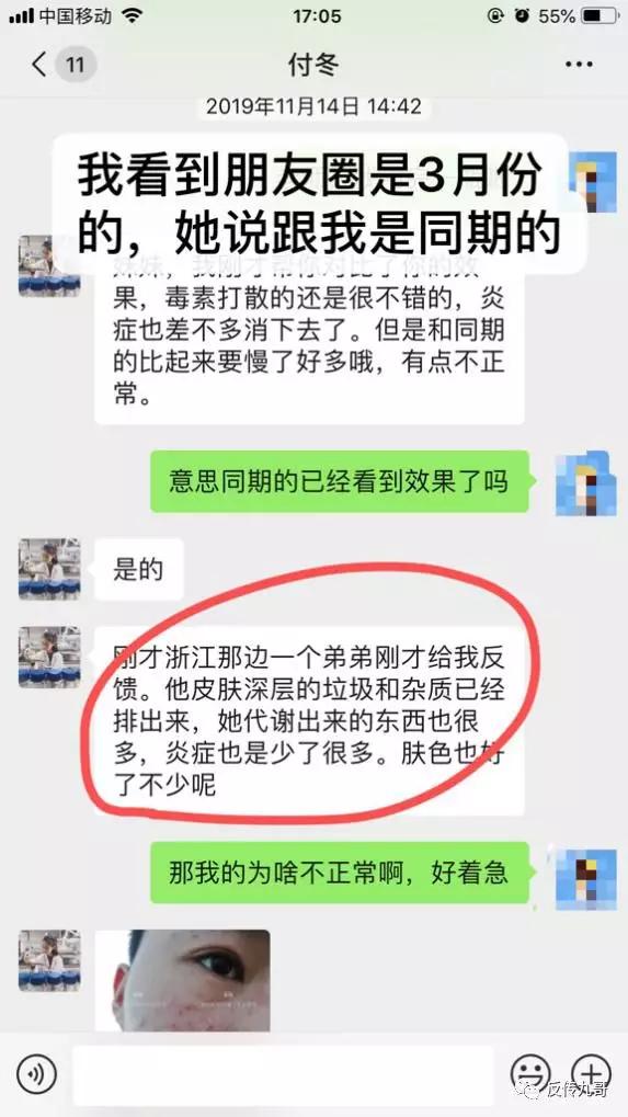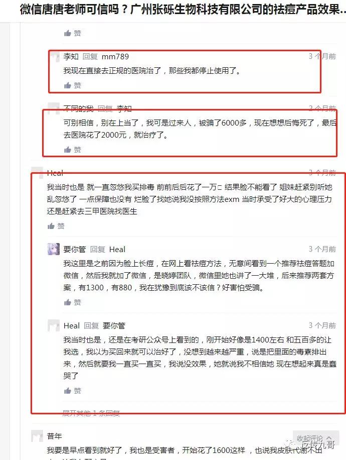 有匿名用户发现这种“xx顾问”的营销方式是张砾生物科技的惯用伎俩,微信加为好友后,利用购买者祛痘心切的心理,以夸张的方式鼓吹产品的功效,一步一步套取用户的钱财。最后皮肤没有护理好,反而蒙受不必要的损失。