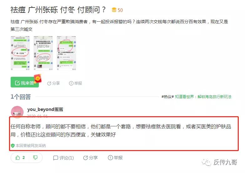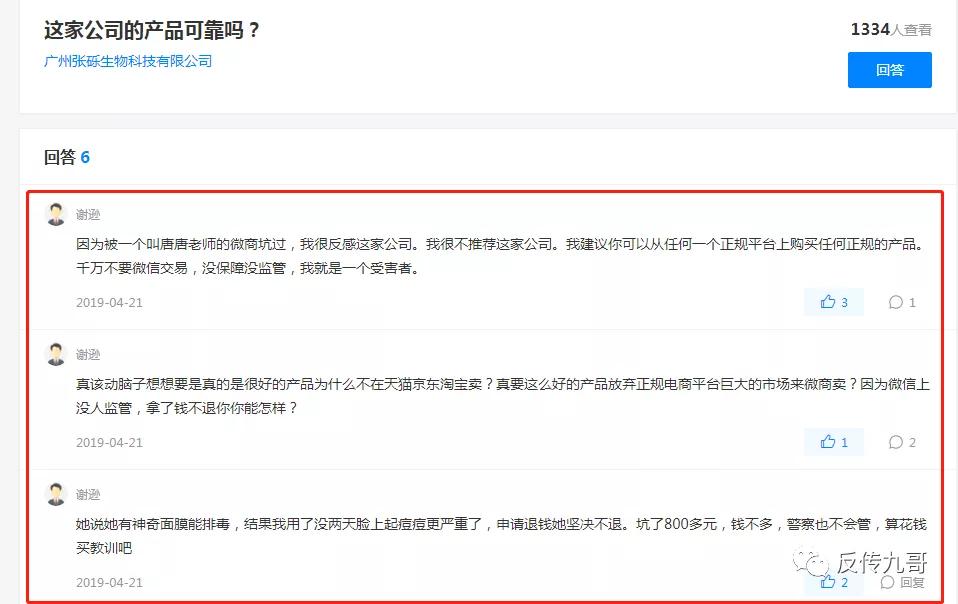 另外,在小编检索张砾生物科技的关键词时,发现了知乎以及其他主流平台上,关于张砾生物科技公司产品的负面评价更是层出不穷,其中就包含修颜泉、顾问付冬女士所推广的祛痘产品。