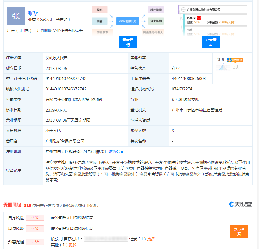 写到这里,小编也是疑问,修颜泉和张砾生物科技有限公司到底是什么关系呢? 小编通过天眼查,企查查得知张砾生物科技是2013年8月份成立,主营范围为医疗技术推广服务,生物医疗技术研究等等。法人代表张黎与赵前程各持一半股份。而这两位代表都曾因某种原因被列为企业经营异常名录,张砾生物科技公司也存在一定风险预警。